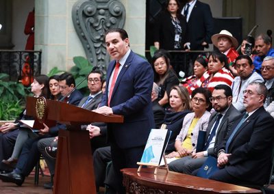 Durante su discurso, el Presidente de la República puntualizó que “el Estado de Guatemala está en disputa: por un lado están los intereses oscuros que siguen agazapados en muchos rincones de la administración pública y algunos sectores de la sociedad; y, por otro, está el mandato que el pueblo de Guatemala le ha otorgado al Poder Ejecutivo: el mandato de rescatar las instituciones y ponerlas de nuevo al servicio del pueblo digno”. Agregó que, “en ese contexto tan complejo, nuestro gobierno tiene la voluntad política y está haciendo los esfuerzos necesarios para contener cualquier agresión contra las personas defensoras de derechos, luchando contra la inercia de viejos hábitos autoritarios y violentos, y contra actores que han capturado diversas instituciones del sistema justicia para proteger a los agresores, a los corruptos, a sus aliados y a todos los que se benefician de la impunidad”.